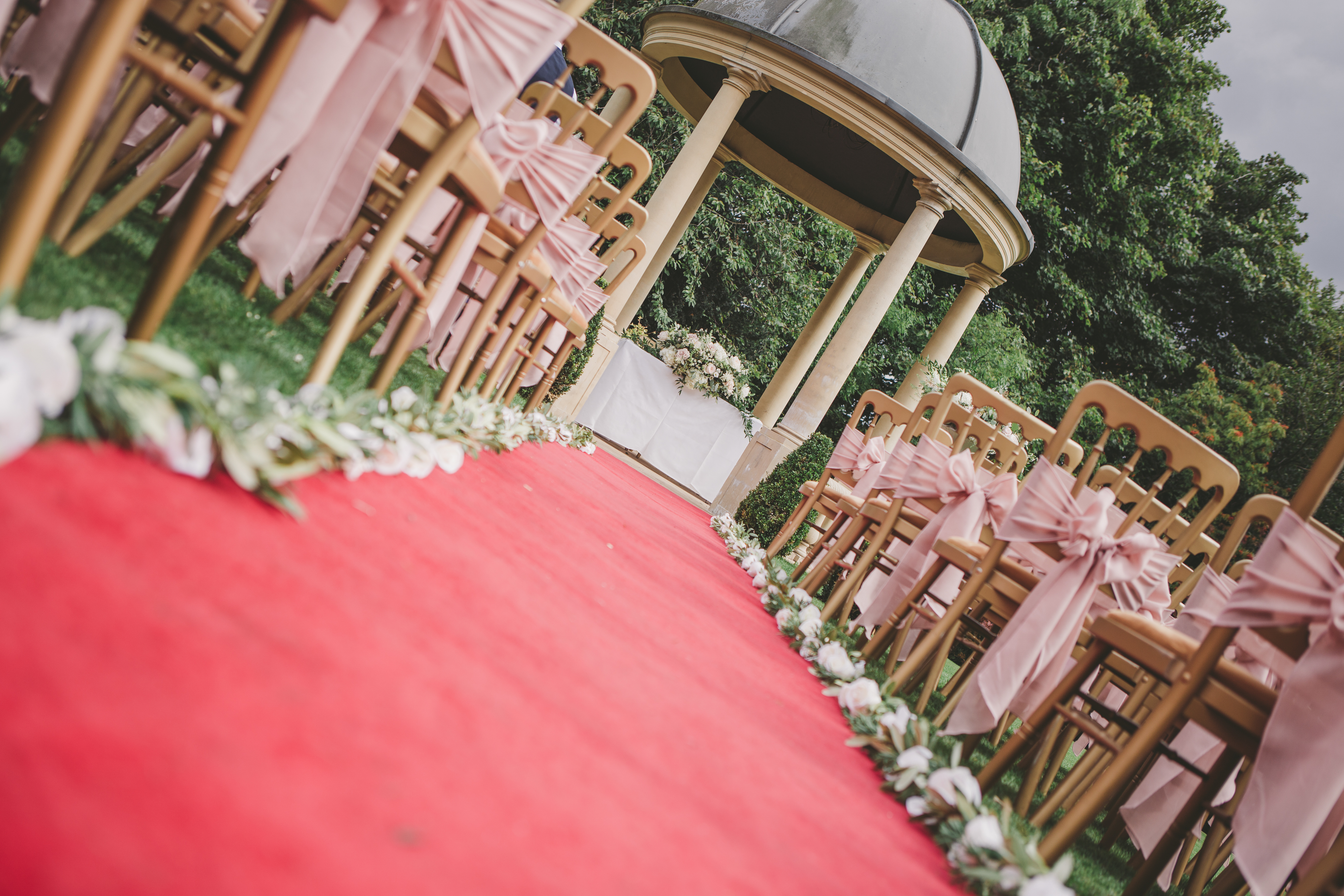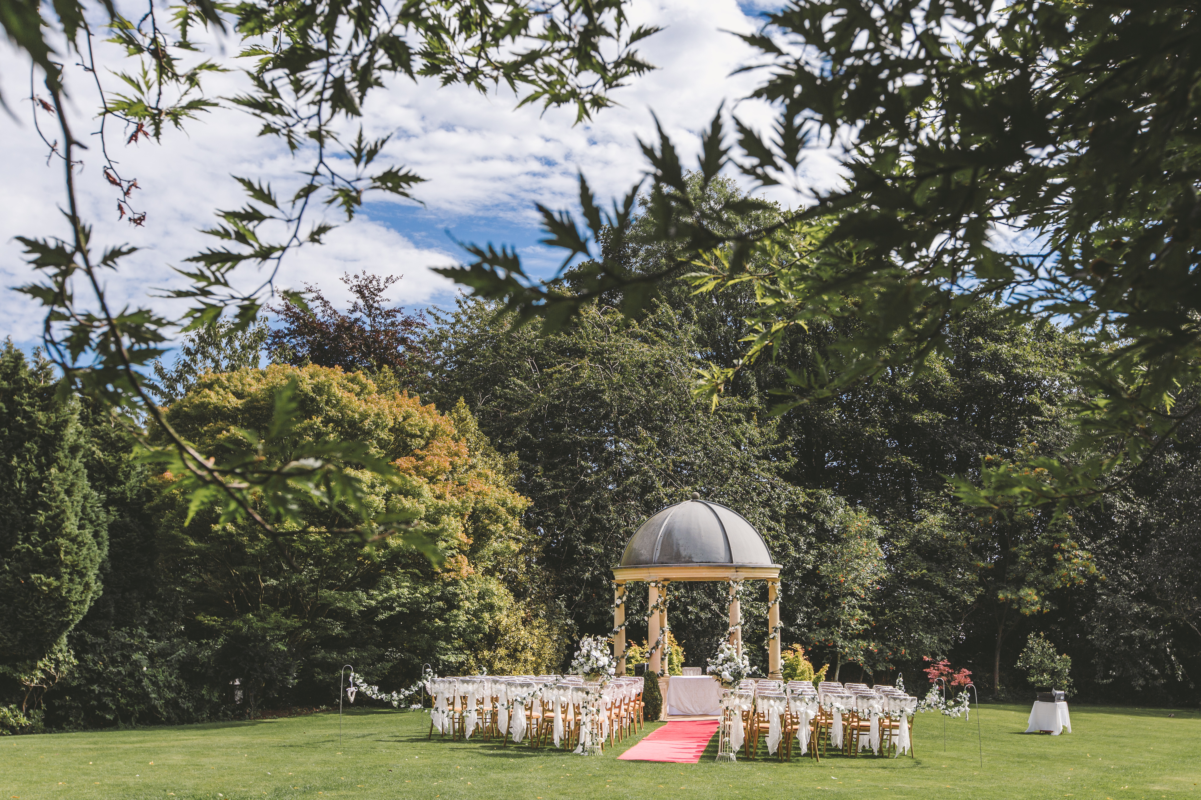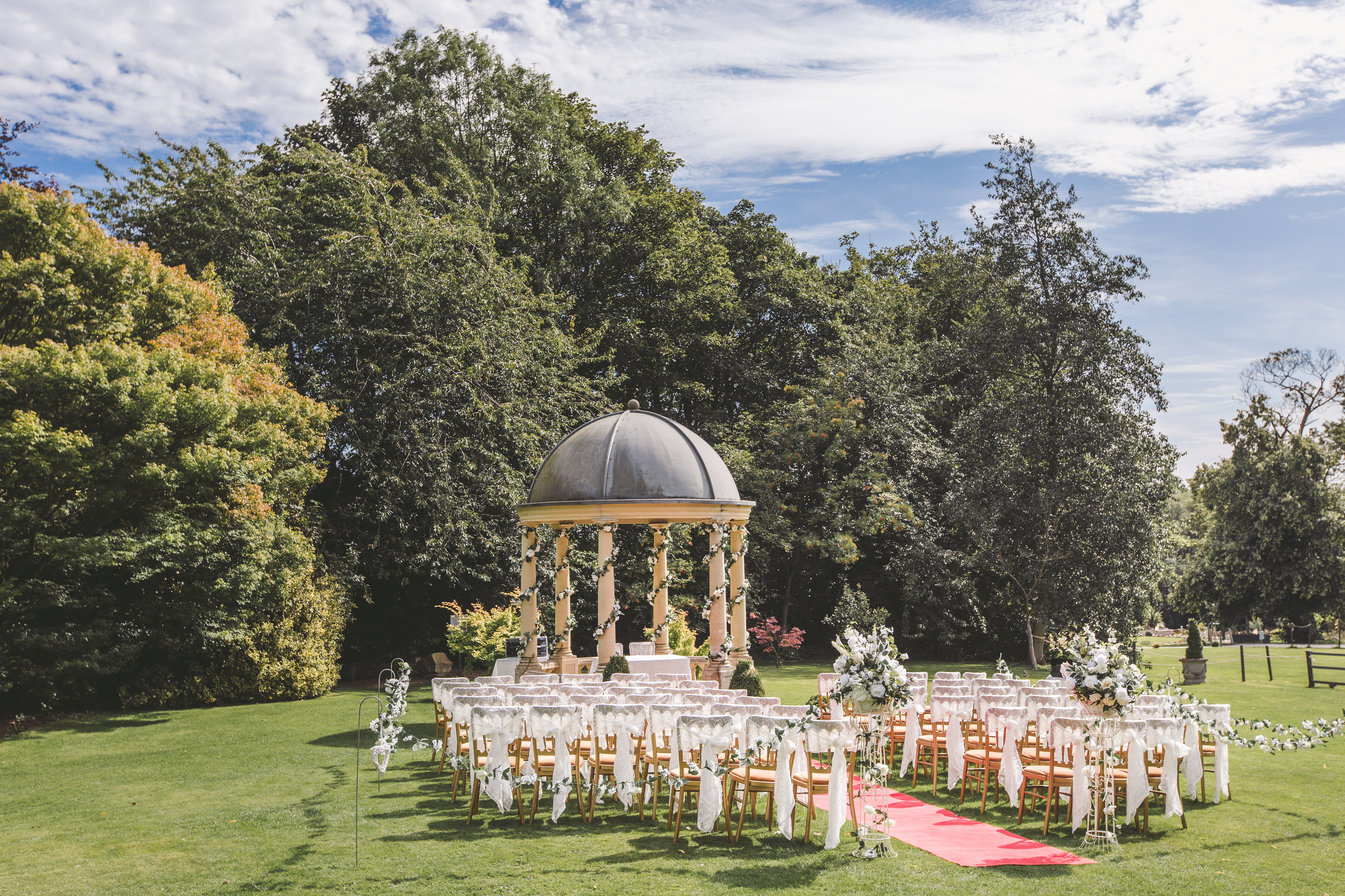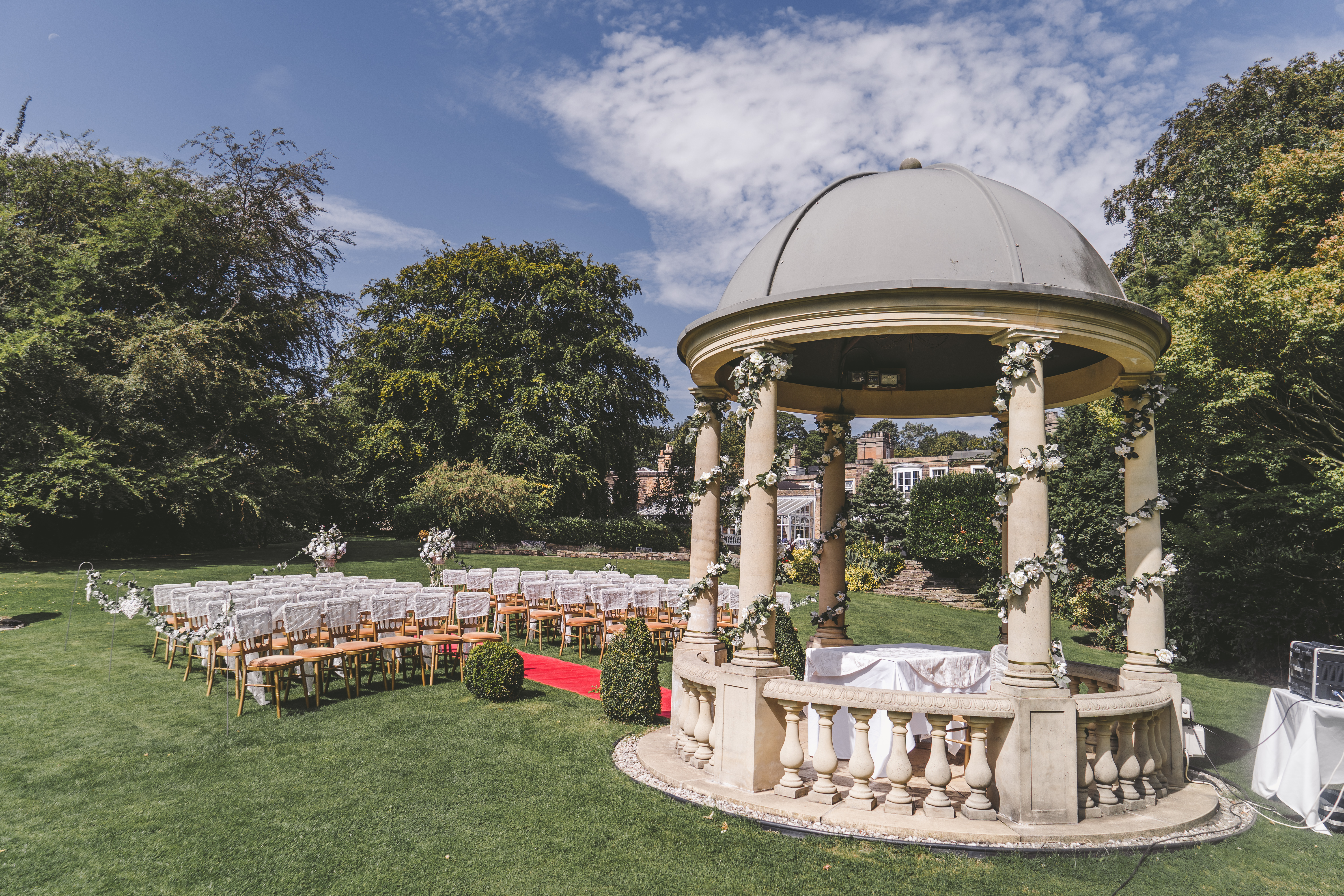 The Garden Pavilion presents rolling hills to one side and our stunning 19th century manor house to the other. The beautiful domed pavilion is the perfect centrepiece to exchange your vows with a luxurious red carpet providing the aisle.