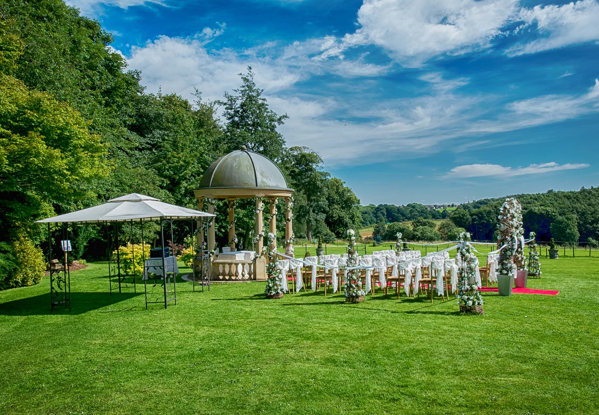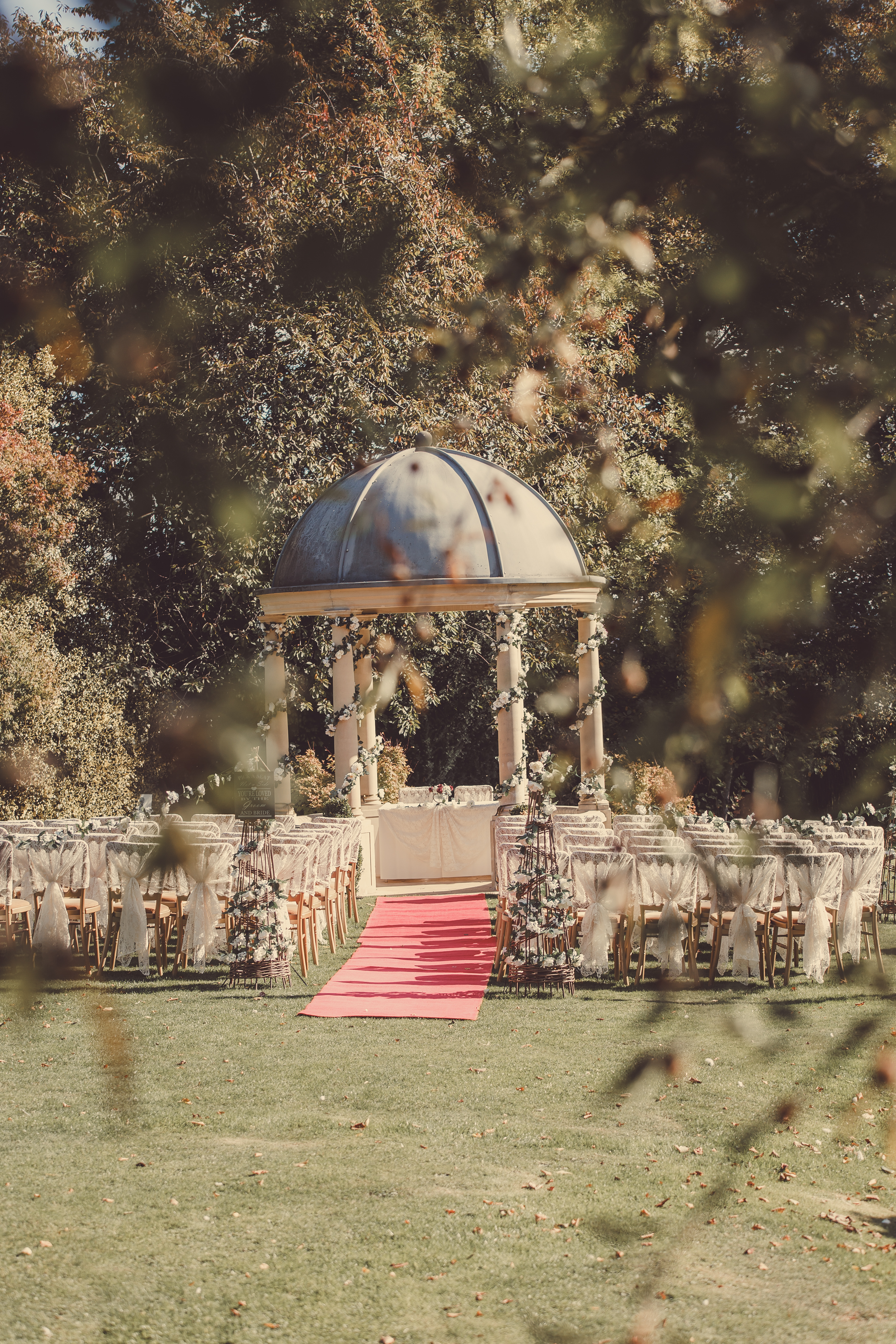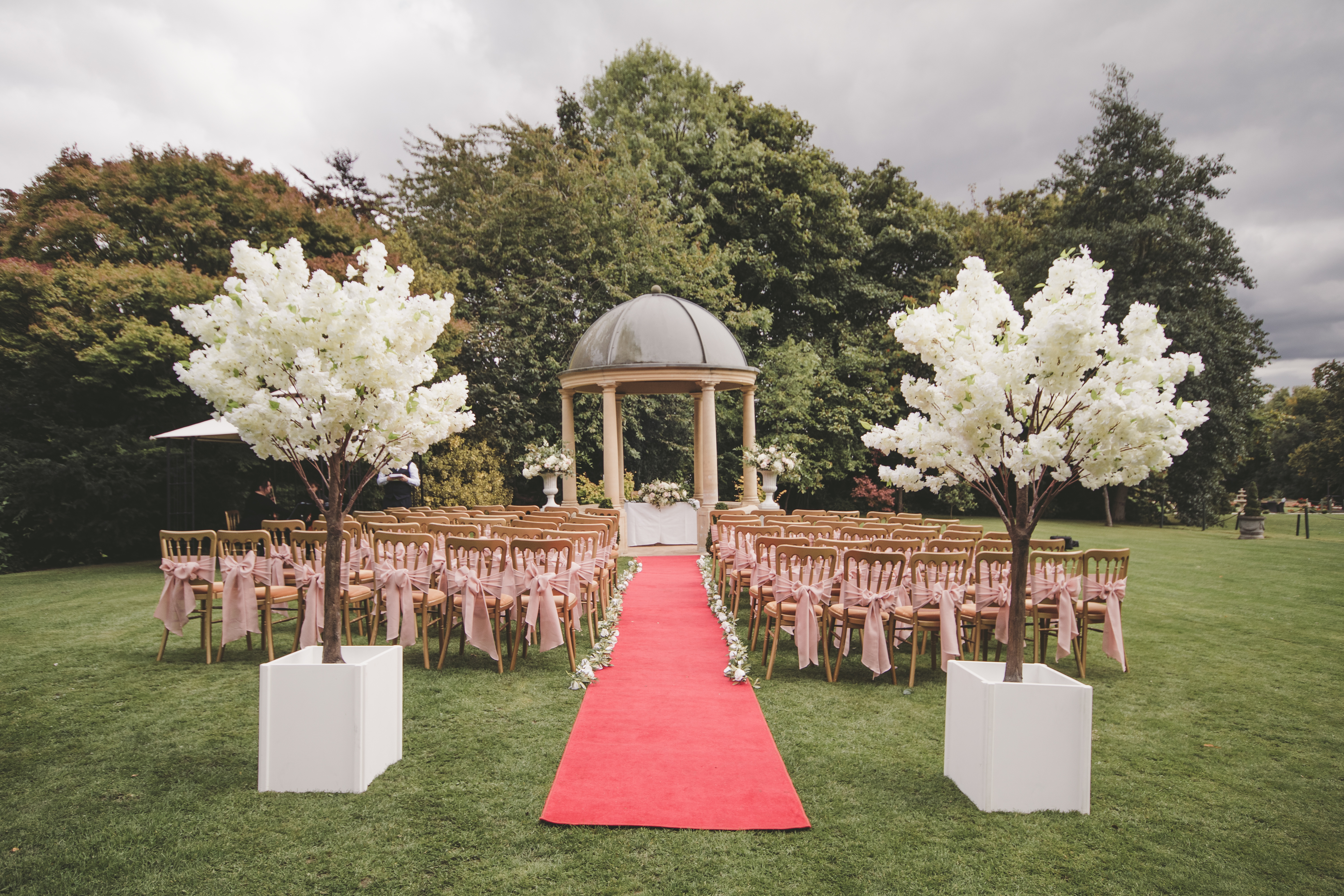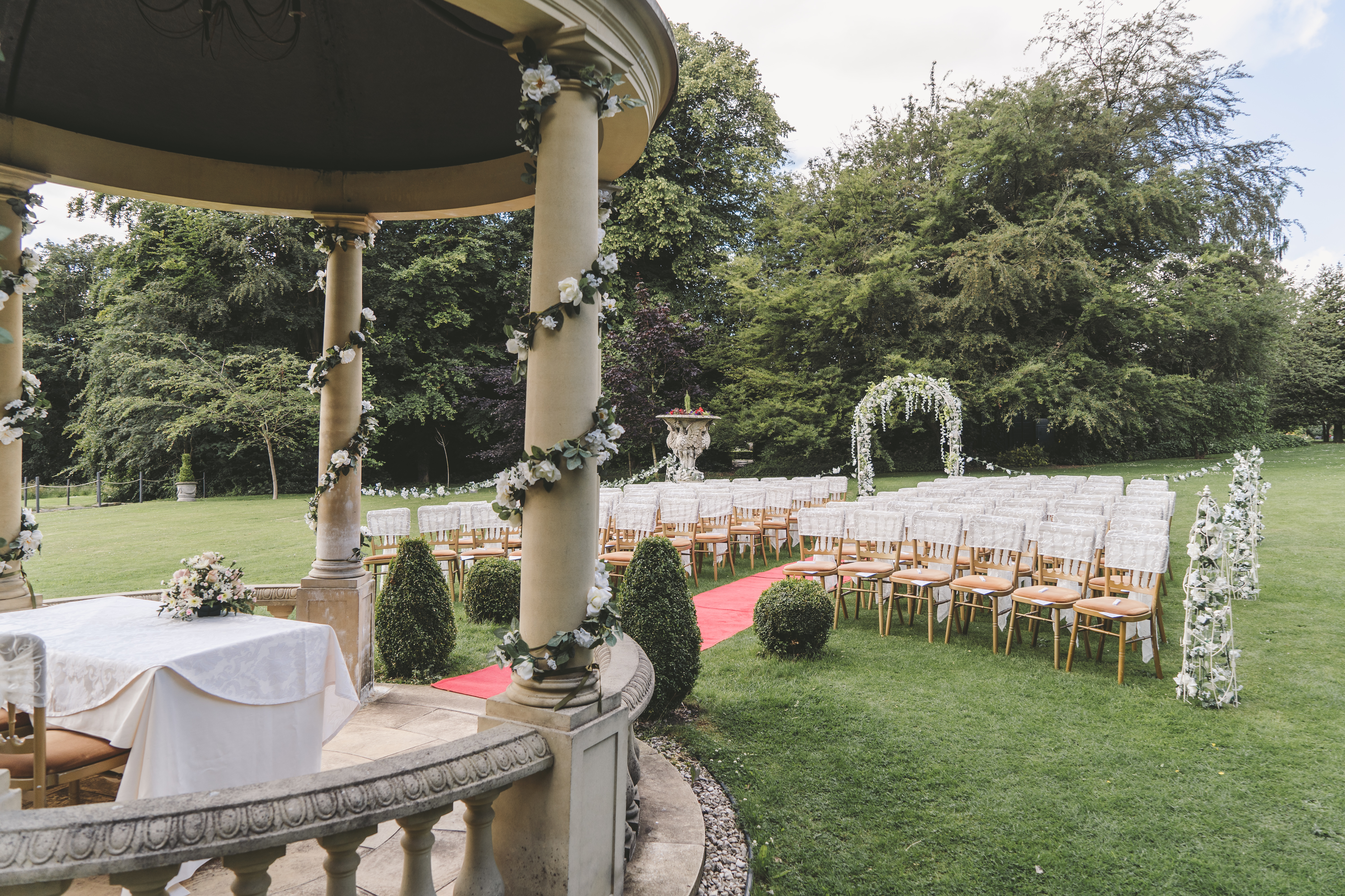 The Garden Pavilion presents rolling hills to one side and our stunning 19th century manor house to the other. The beautiful domed pavilion is the perfect centrepiece to exchange your vows with a luxurious red carpet providing the aisle.