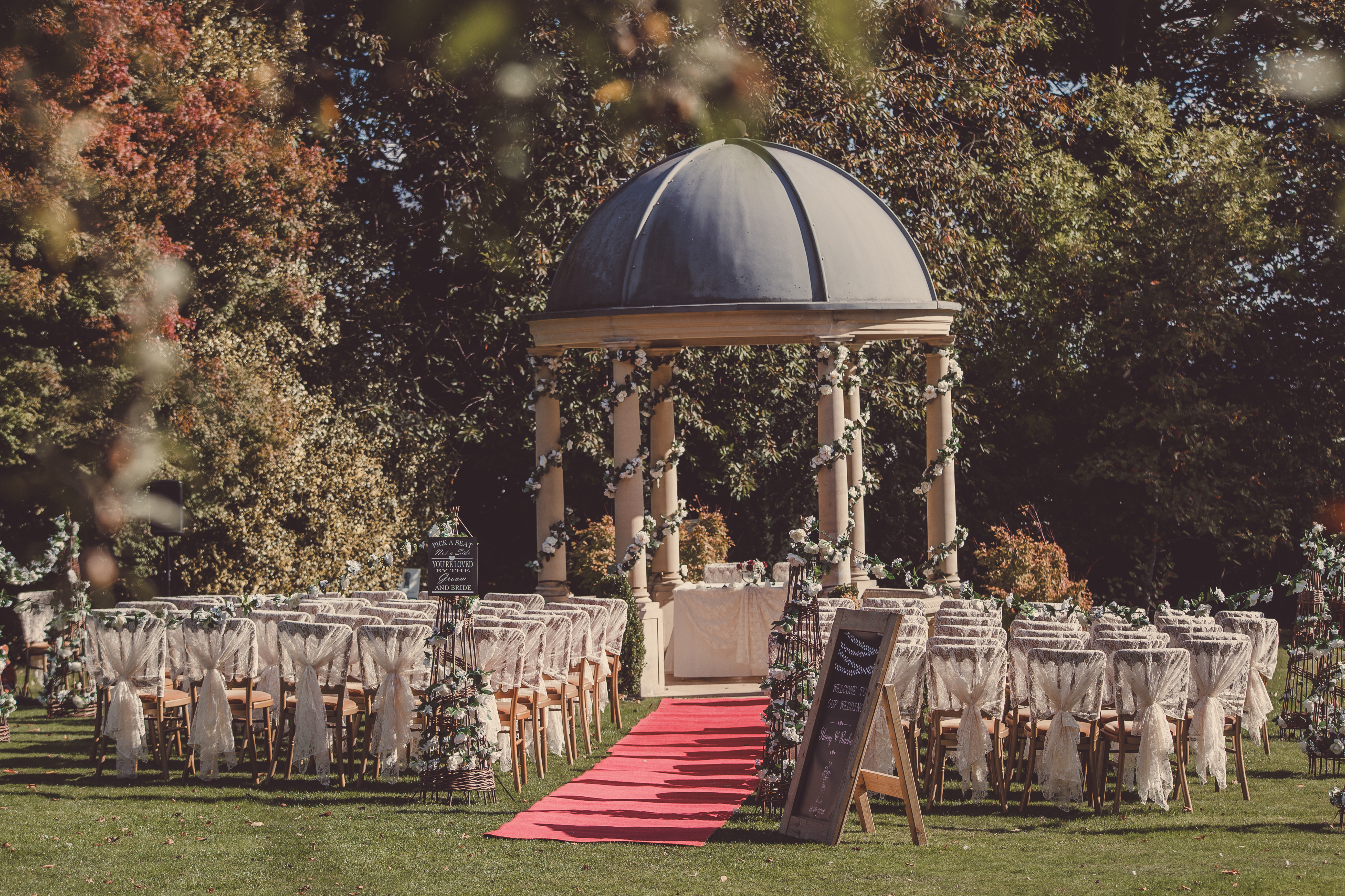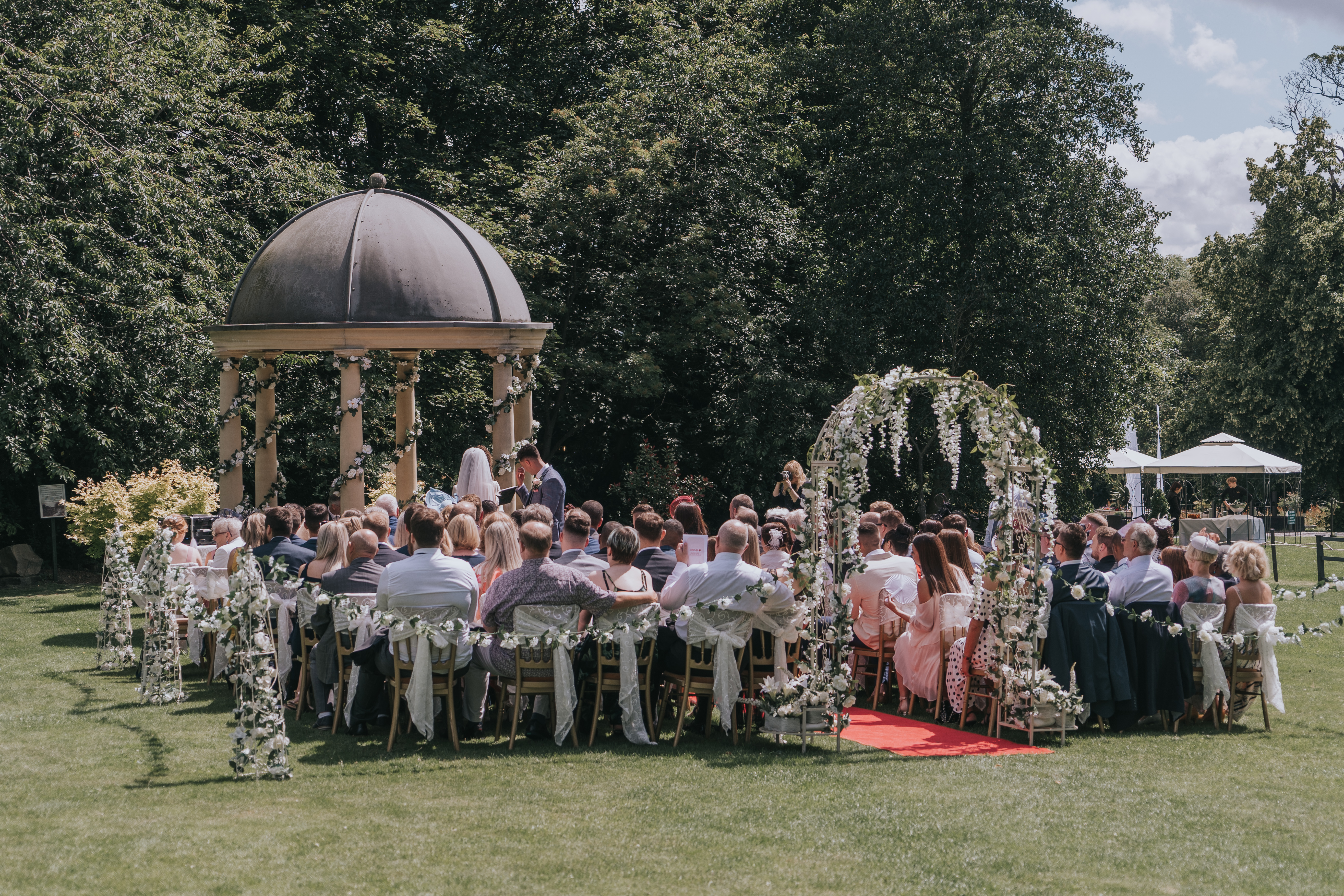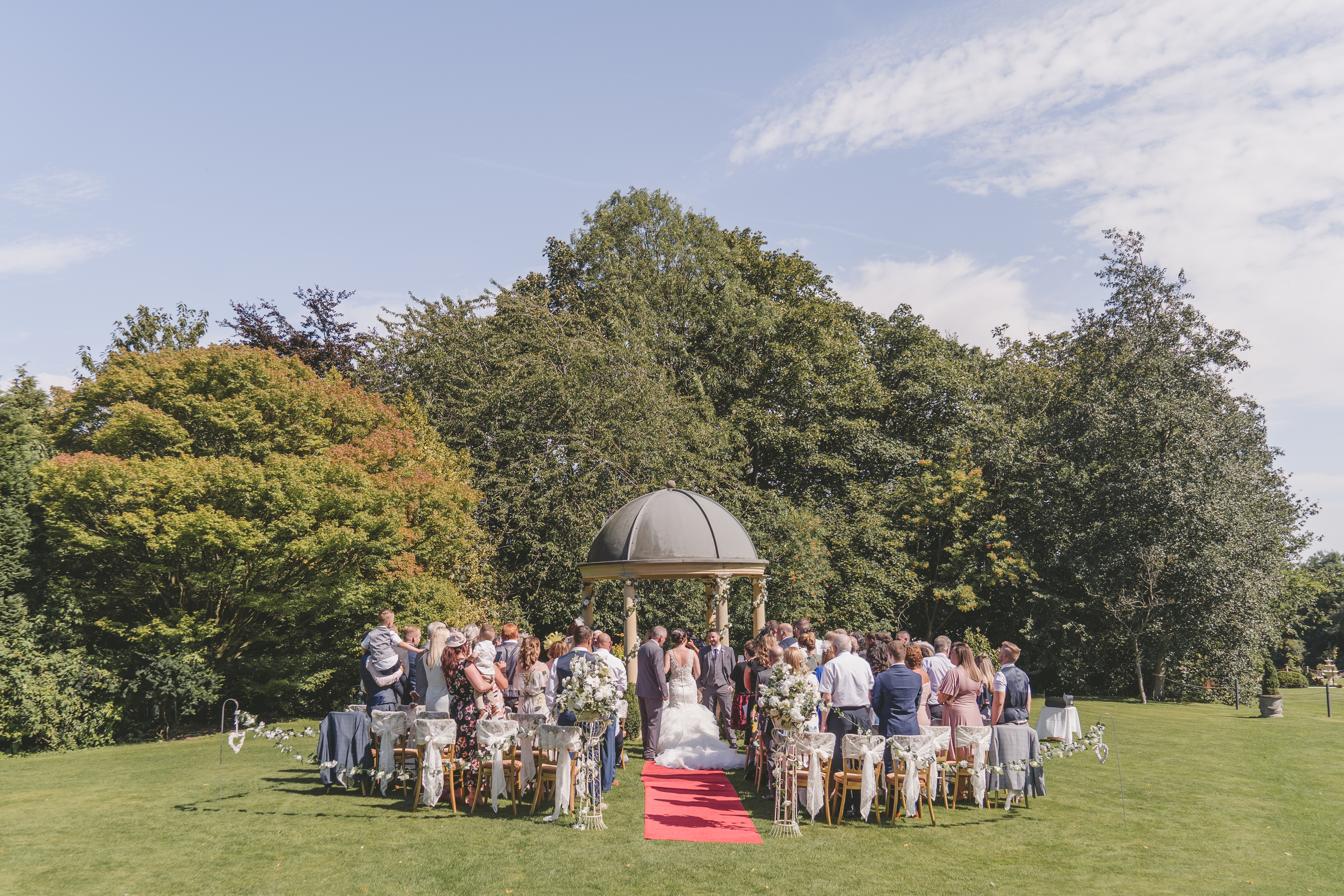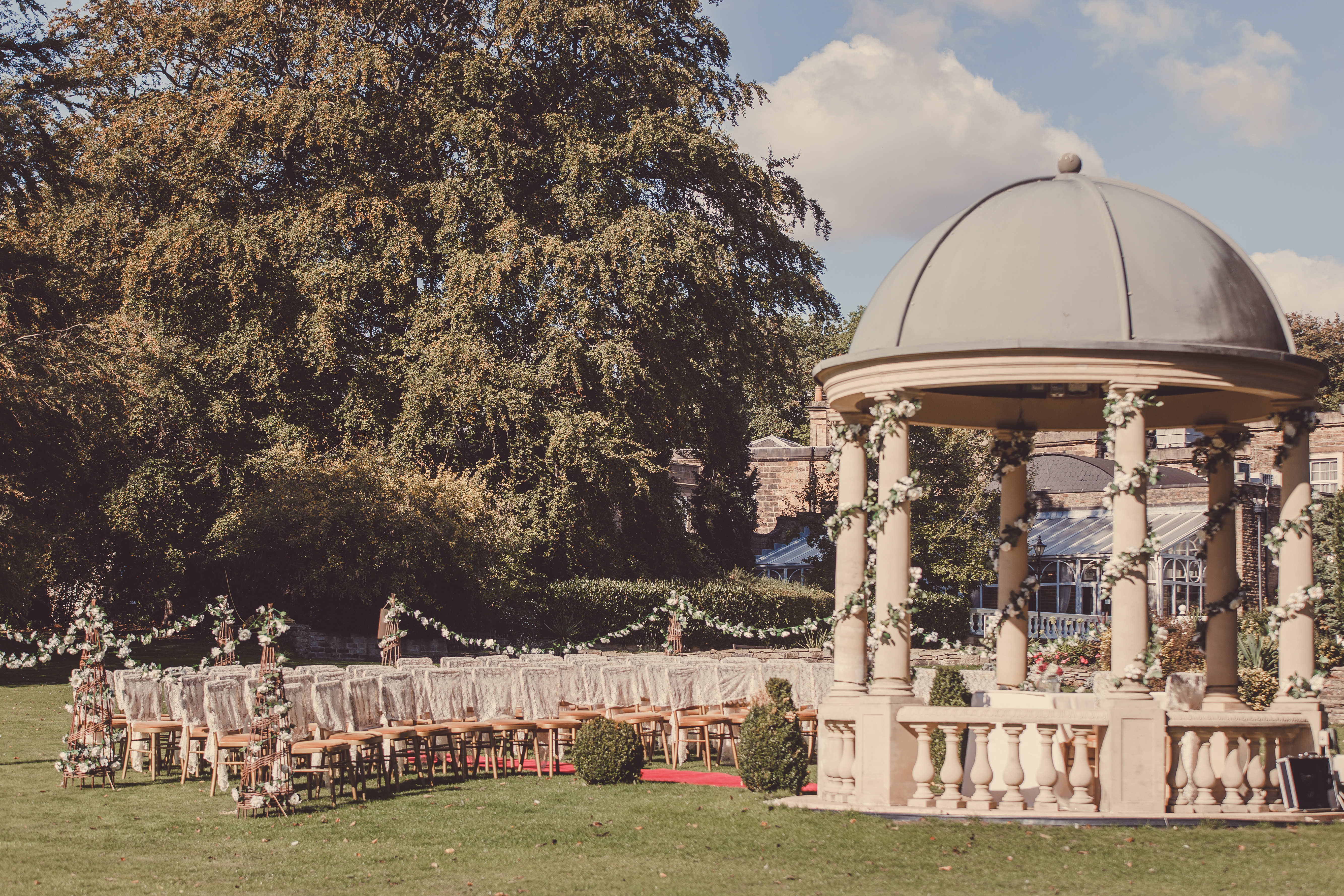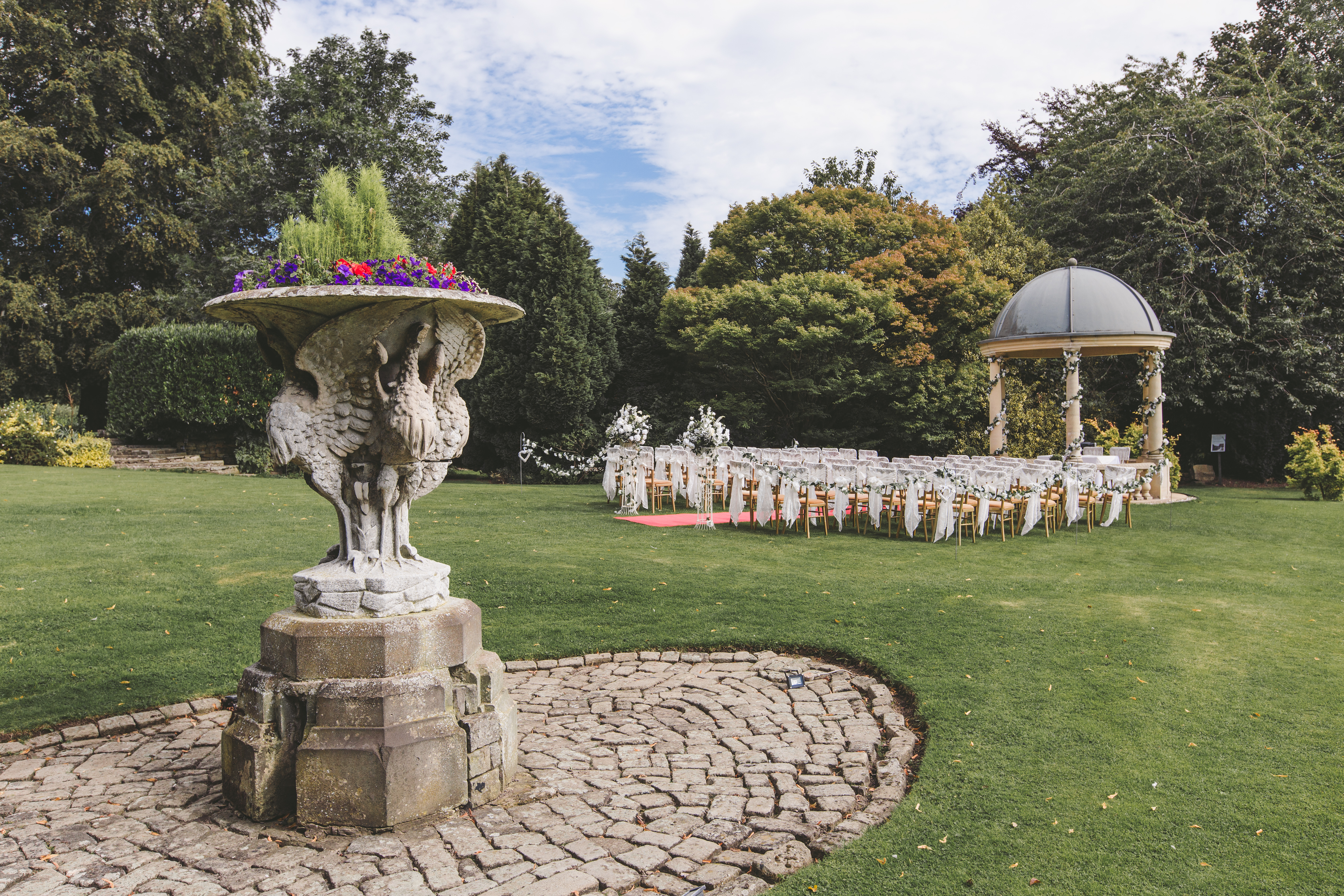 The Garden Pavilion presents rolling hills to one side and our stunning 19th century manor house to the other. The beautiful domed pavilion is the perfect centrepiece to exchange your vows with a luxurious red carpet providing the aisle.